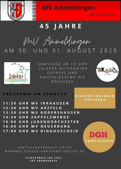 Im August findet das große Jubiläumsfest mit dem Isleker Musikanten-Express und den BRASSers - bekannt von Woodstock der Blasmusik - im DGH Ammeldingen statt.